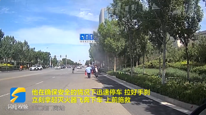 在菏澤路和西三路路口附近,看見(jiàn)前方有濃煙冒出,感覺(jué)就是著火了,把車停到路邊,拉好手剎,提著滅火器下去,幾分鐘就把火滅了。確認(rèn)火勢(shì)得到控制后,李斌離開(kāi)了現(xiàn)場(chǎng),迅速返回到了他的工作崗位上。事后回憶起此事,他也表示這是他應(yīng)該做的。